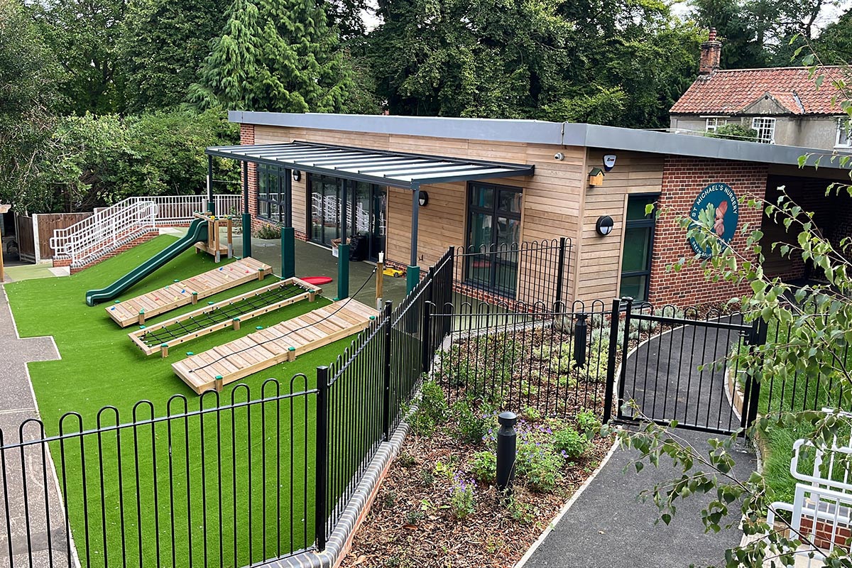 NCL constructed a freestanding timber frame structure, covered in cedar with masonry accents, featuring a spacious covered front facade made up of large windows and doors. As part of the project, we designed and built new classroom areas with customised toilet facilities inside the building. Additionally, we constructed a new, secure outdoor play area outside the building, using the natural levels of the site and incorporating features such as slides and climbing ramps.